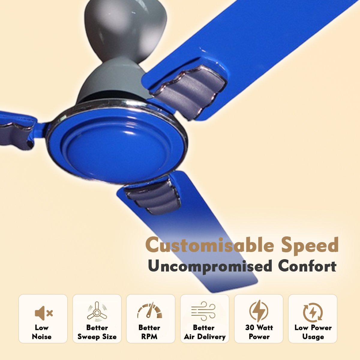 Construction: Metal blades, silent operation, 5,000+ continuous working hours durability, safety wire included